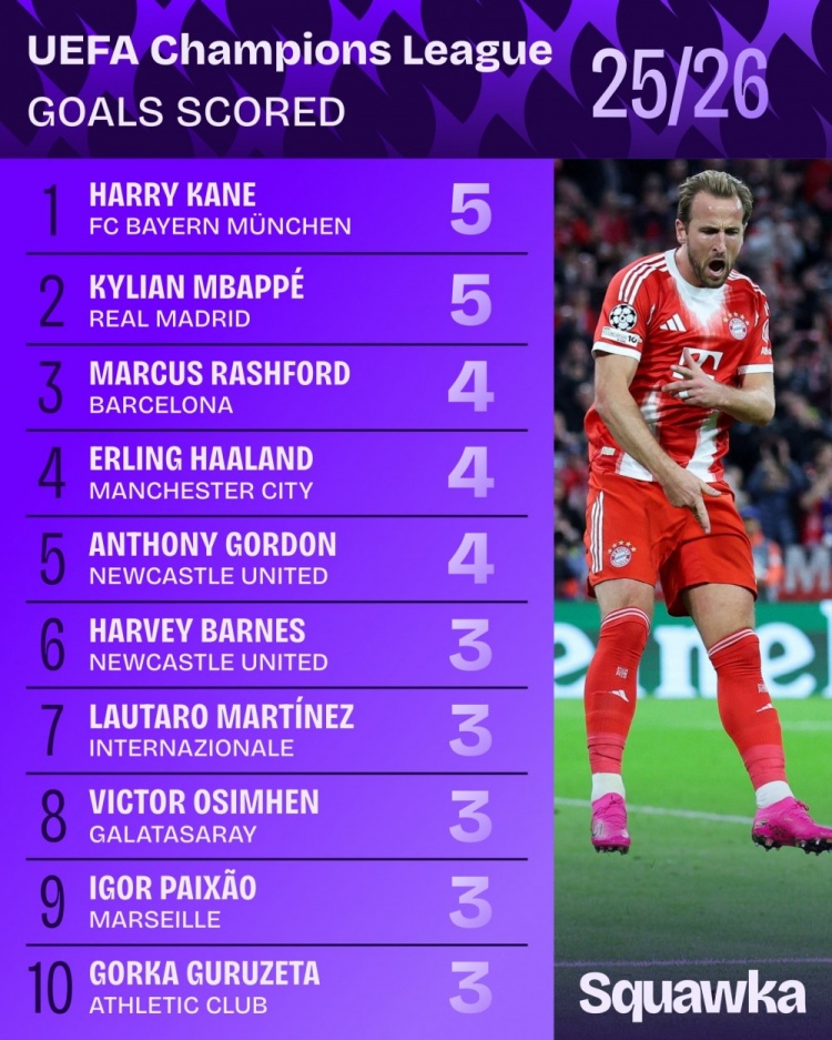 10月23日讯 本赛季欧冠职业联赛 阶段已战罢3轮,Squawka统计了到目前为止欧冠得分 榜,苏超直播在线观看拜仁前场球员凯恩和皇马攻击手姆巴佩都打进5球,分列前二位。