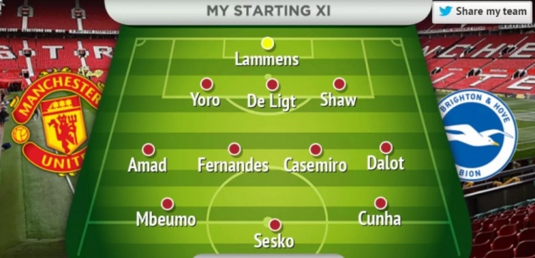 对布莱顿!曼晚预测曼联杆位:姆贝莫、舍什科、库尼亚前场三叉戟