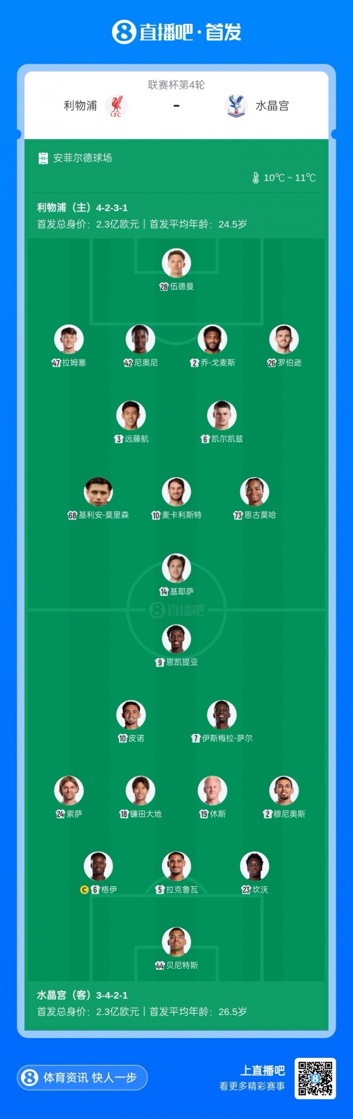 利物浦杆位:28-伍德曼、2-戈麦斯、6-凯尔凯兹、26-罗伯逊、47-拉姆塞、42-尼奥尼、3-远藤航、68-莫里森、10-麦卡利斯特、14-基耶萨、73-恩古莫哈