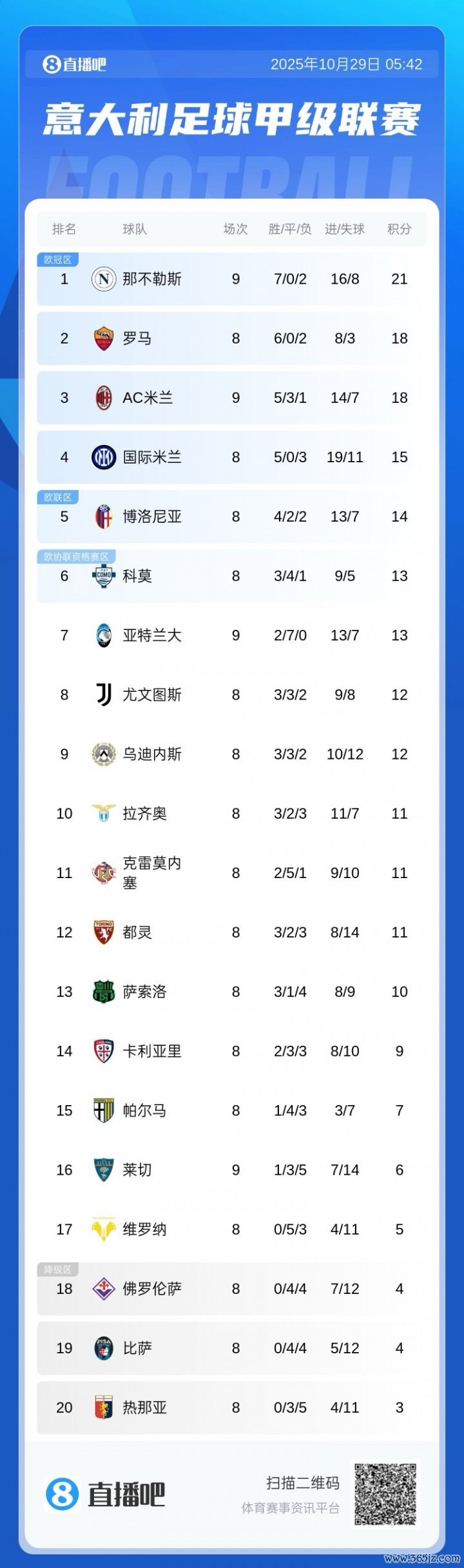 10月29日讯 本轮意甲,那不勒斯1-0莱切,米兰1-1战平亚特兰大。